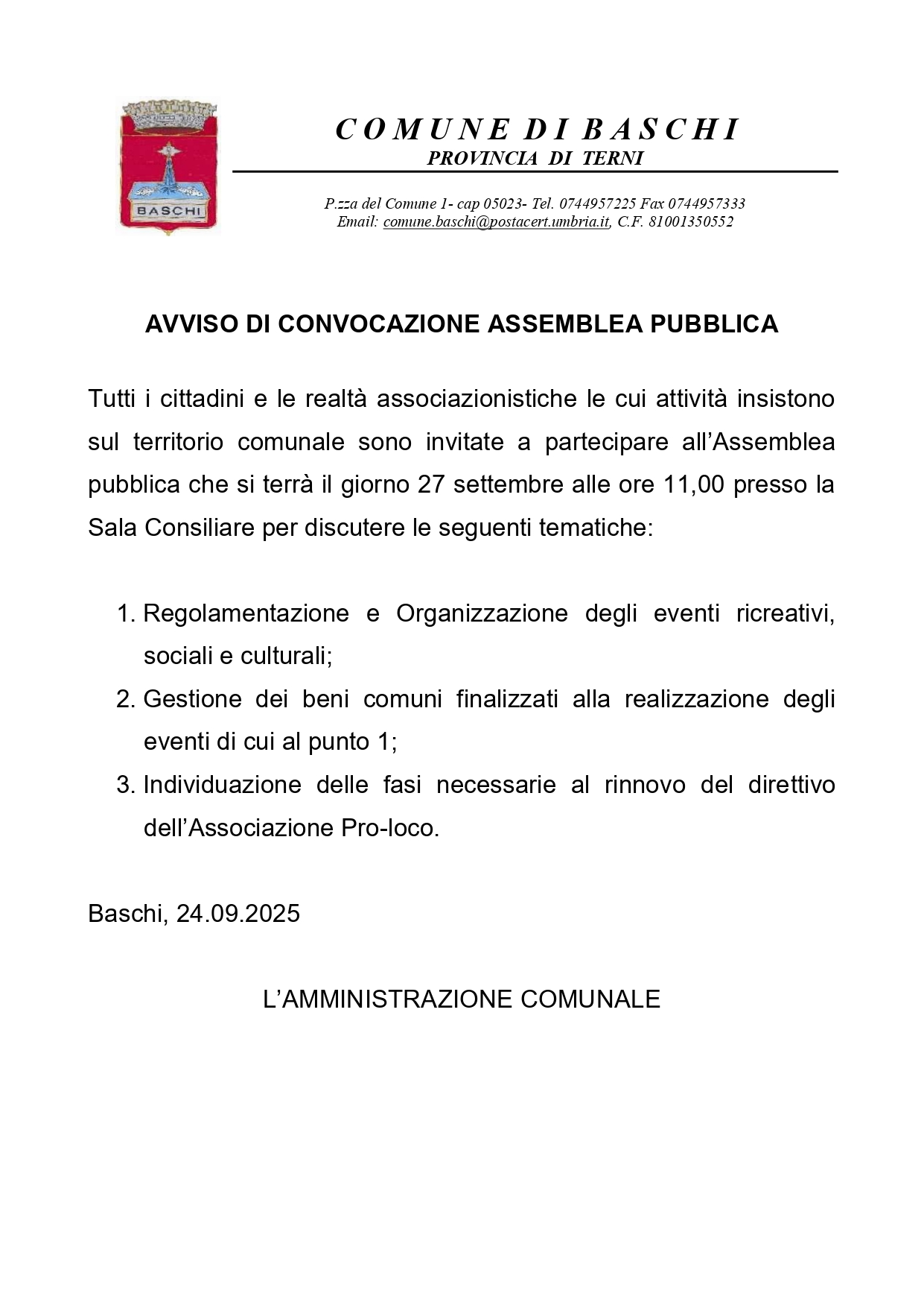 I cittadini e le realtà associazionistiche le cui attività insistono sul territorio sono invitate all’Assemblea pubblica che si terrà il giorno 27 settembre alle ore 11,00 .